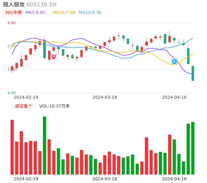 值得注意的是:2024年03月中金公司的徐卓楠/王杰睿分析师,首次发布关于丽人丽妆的研究报告,标题为:丽人丽妆(605136):23年扭亏符合预告 主业仍有较大压力。