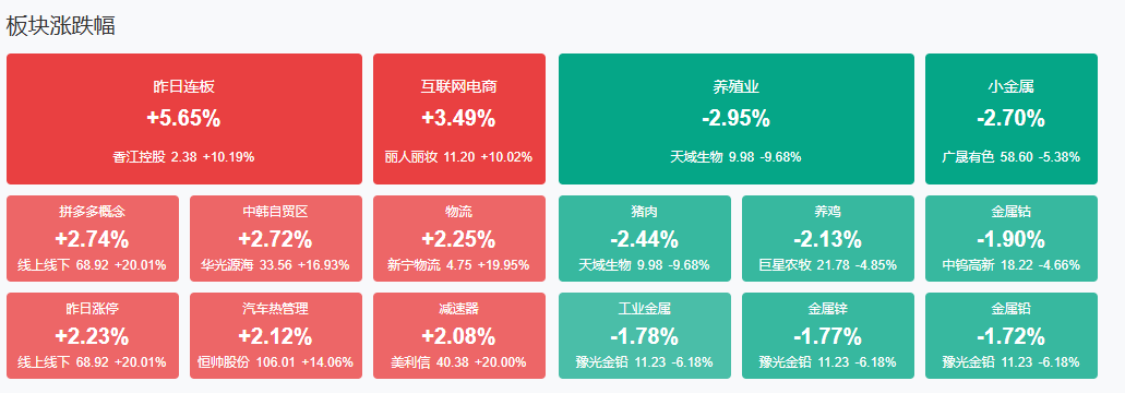 板块方面,电商、统一大市场、机器人等板块涨幅居前,有色金属、猪肉、电池等板块跌幅居前。截至收盘,沪指跌0.10%,深成指跌0.26%,创业板指跌0.32%。