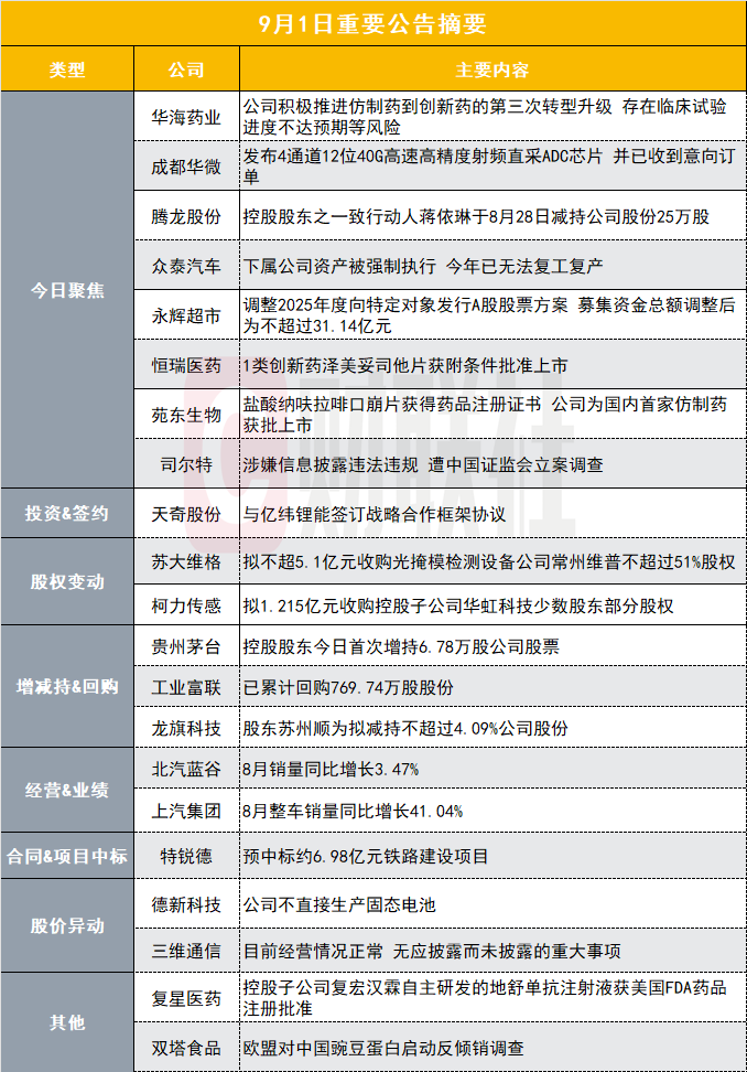 贵州茅台(600519.SH)公告称,公司控股股东茅台集团于2025年9月1日通过集中竞价交易方式,增持67,821股公司股票,占公司总股本的0.0054%。增持金额为1亿元。该增持为上周五披露的“拟自2025年9月1日至2026年2月28日增持不低于30亿元且不高于33亿元”计划的首次实施,茅台集团将继续按计划以自有资金和自筹资金执行后续增持。