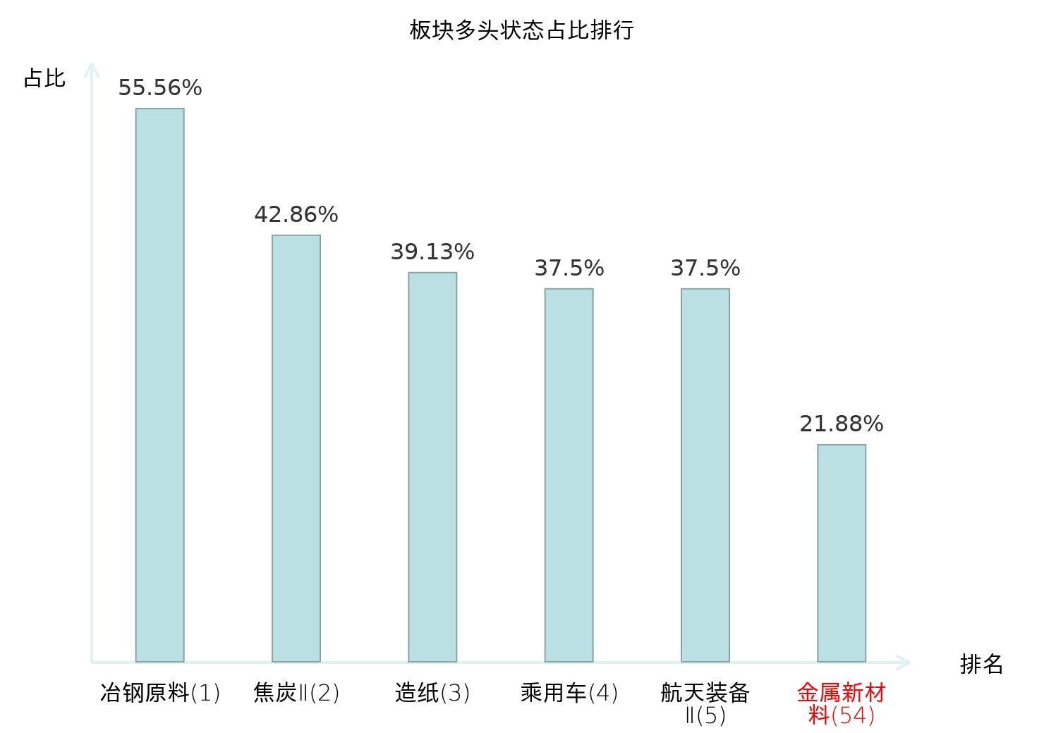 全市场所有行业板块中主力多头状态占比排名中,冶钢原料板块位居第一。房屋建设Ⅱ板块名次提升最快,较昨日上升84位。