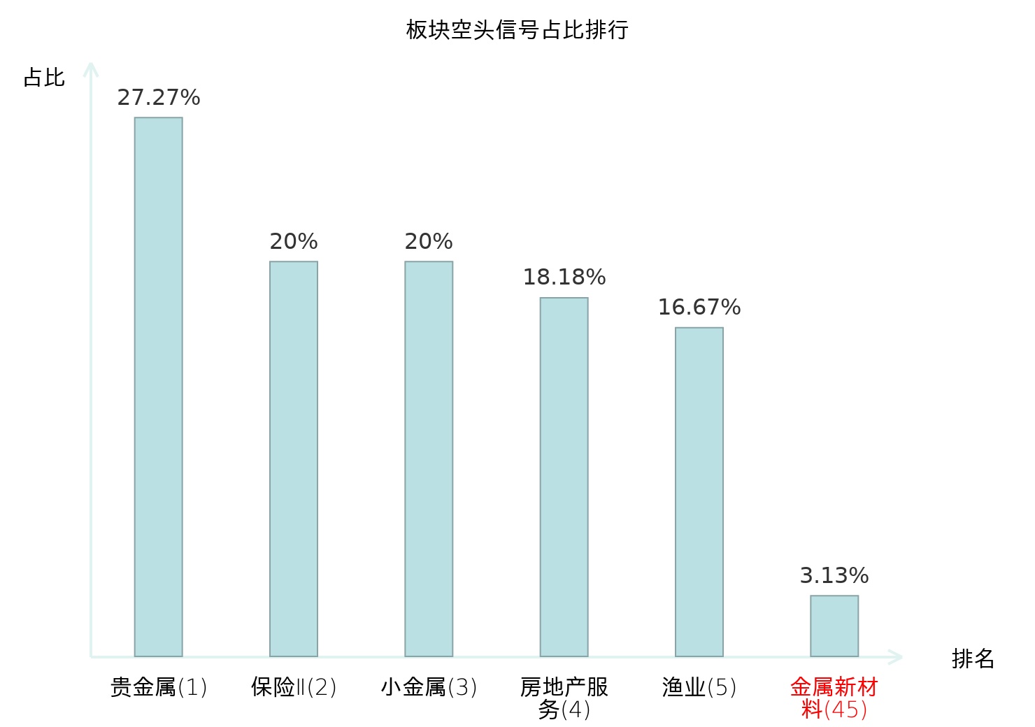 全市场所有行业板块中主力空头信号占比排名中,贵金属板块位居第一。小金属板块名次提升最快,较昨日上升117位。