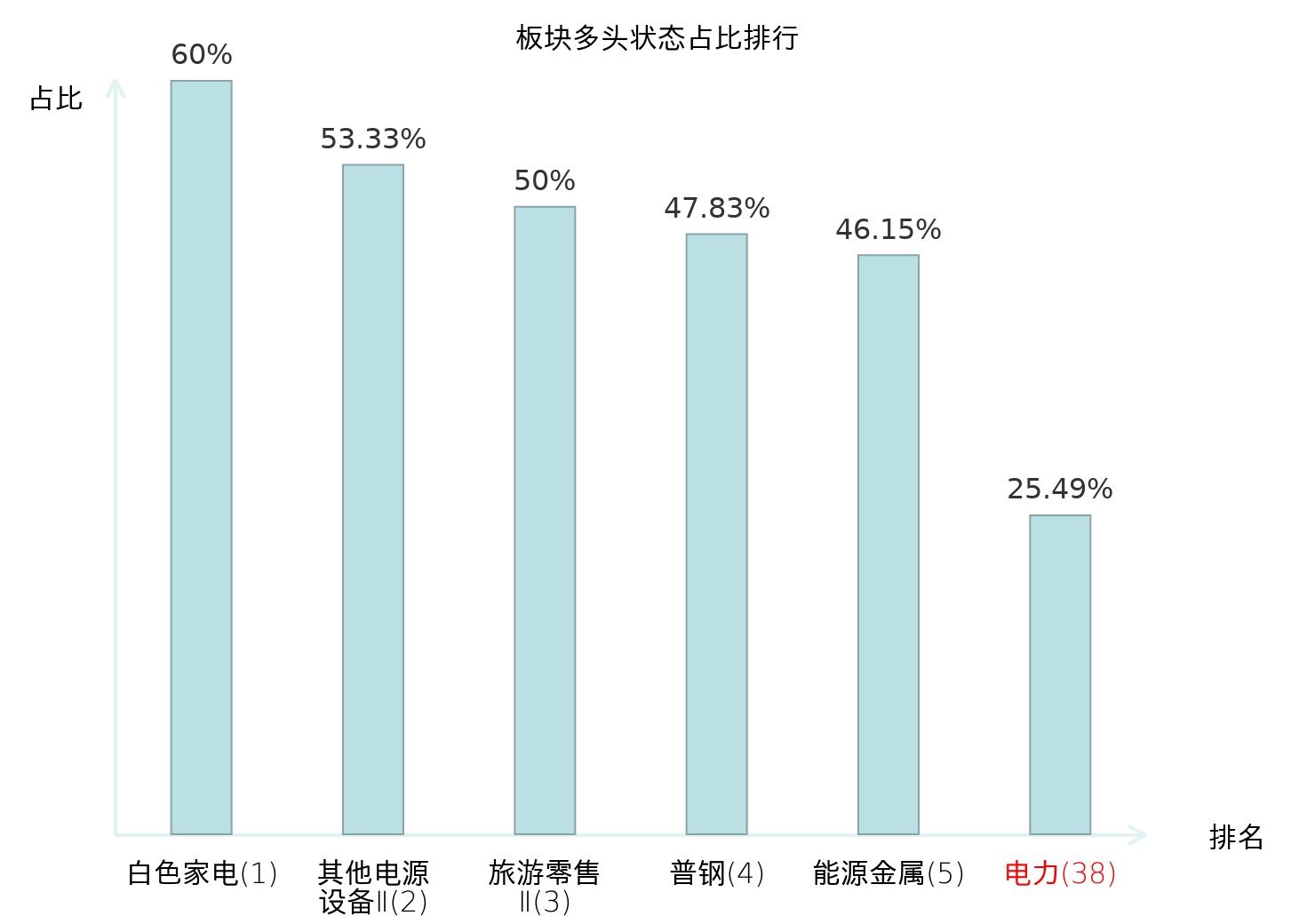 全市场所有行业板块中主力多头状态占比排名中,白色家电板块位居第一。照明设备Ⅱ板块名次提升最快,较昨日上升55位。