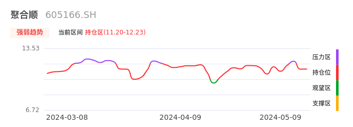 我们来看一下该股的九方特色指标强弱趋势的情况:聚合顺近日从压力区回到持仓区。股价快速拉升后出现持续调整,目前出现启稳回暖态势。后续重点关注上方压力位:12.23元是否能再次上攻。