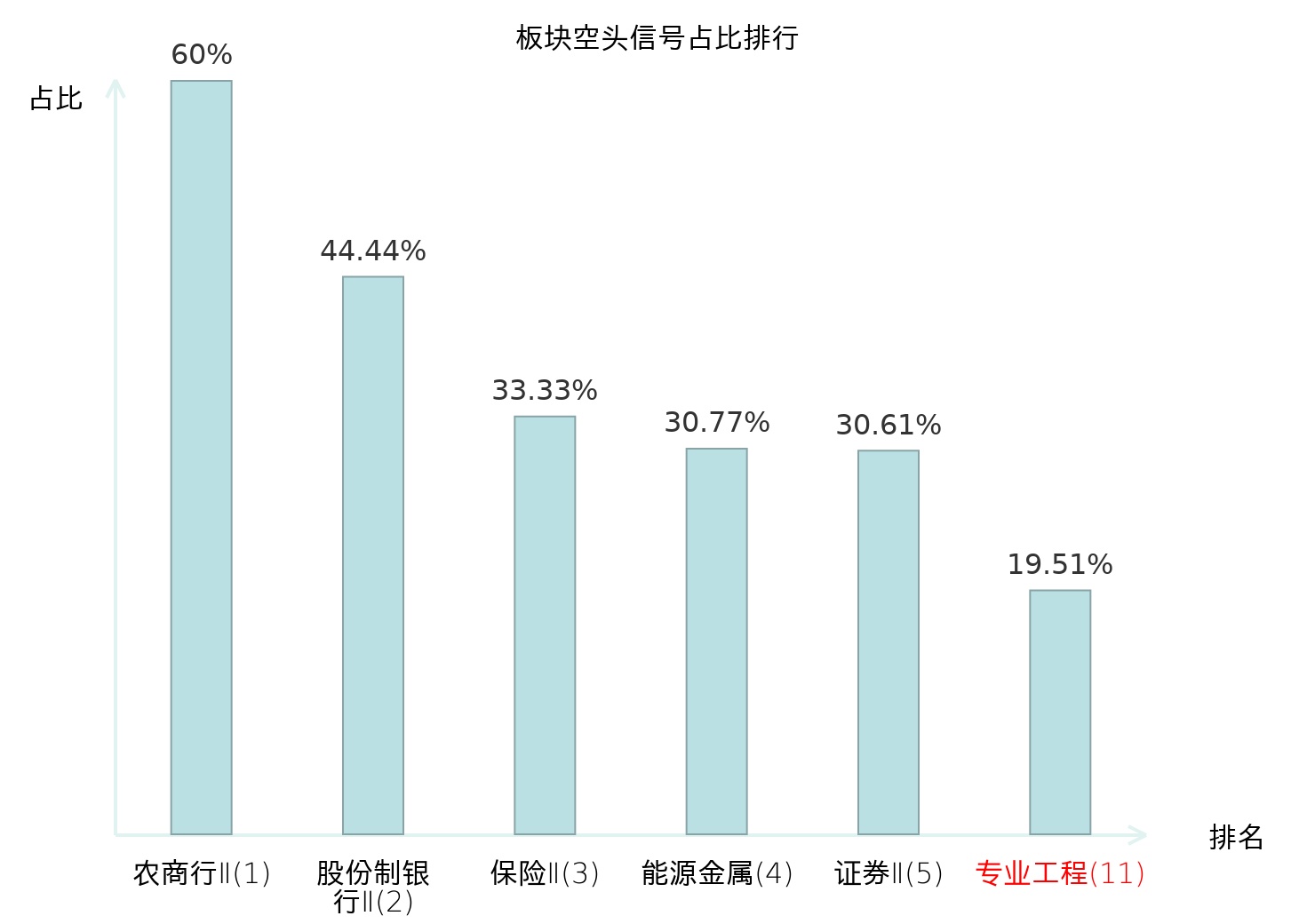 全市场所有行业板块中主力空头信号占比排名中,农商行Ⅱ板块位居第一。证券Ⅱ板块名次提升最快,较昨日上升119位。