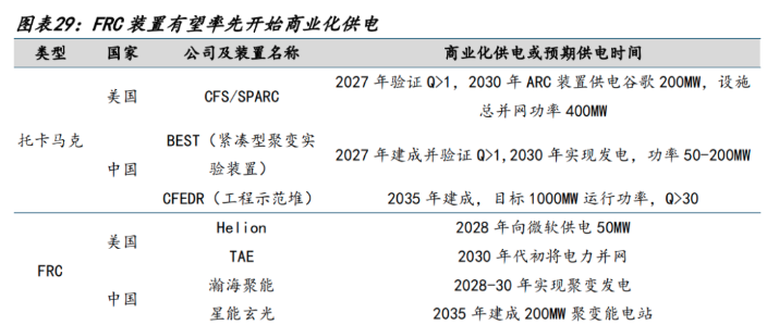 结构简单、模块化设计,从研发到示范电站的周期比托卡马克缩短50%以上;国际上Helion、TAE等公司已在2028-2030年实现商业化供电的规划,国内星能玄光计划2035年建成200MW电站。