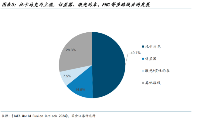核聚变是轻原子核结合成较重原子核并放出巨大能量的过程,原材料资源相对丰富且无污染排放的可控核聚变被视为人类“终极能源”。当前可控核聚变技术路线主要有三种:重力场约束核聚变、激光惯性约束核聚变和磁约束核聚变。其中磁约束核聚变在当前占据主流地位,主要技术包括托卡马克(环形磁场)、直线型场反位形(Field-Reversed Configuration, FRC)、仿星器(复杂外线圈磁场)及反向场箍缩、磁镜等。