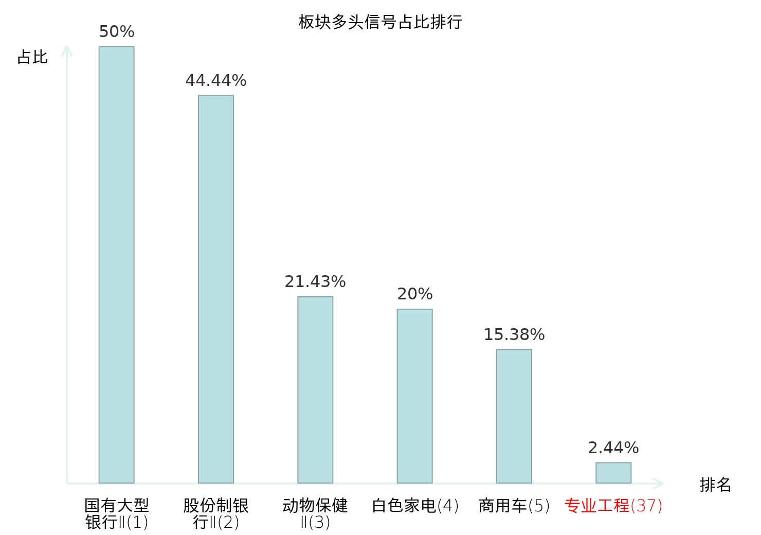 全市场所有行业板块中主力多头信号占比排名中,国有大型银行Ⅱ板块位居第一。房屋建设Ⅱ板块名次提升最快,较昨日上升114位。