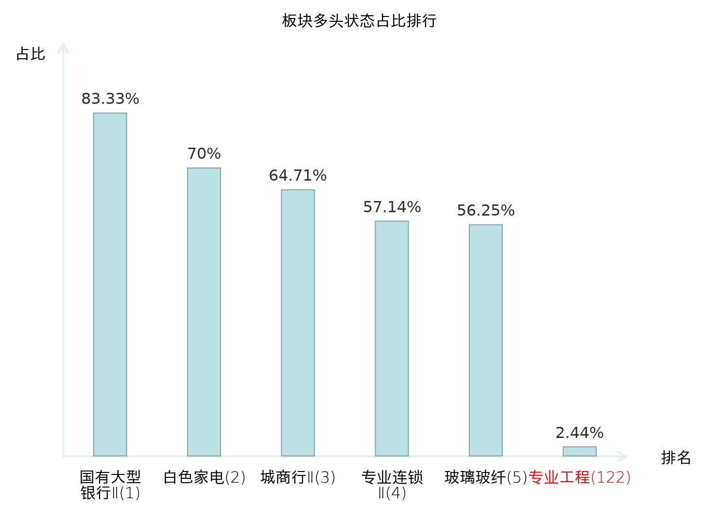 全市场所有行业板块中主力多头状态占比排名中,国有大型银行Ⅱ板块位居第一。食品加工板块名次提升最快,较昨日上升51位。