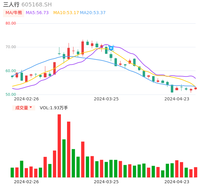 04月23日,三人行收报52.88,股价涨幅1.13%,成交金额1.01亿元,换手率1.31%。