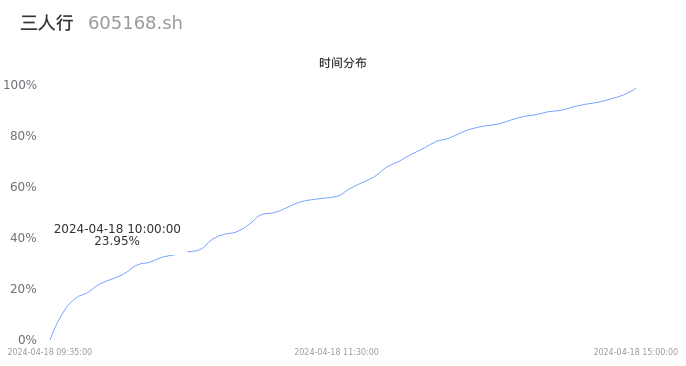 605168三人行2024年04月18日成交2.88万手,成交金额1.52亿元,相较昨日缩量3452手,换手率1.96%,成交清淡。