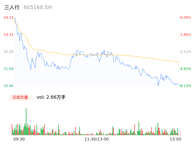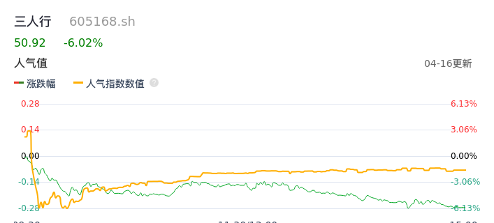 04月16日,三人行收报50.92,股价涨幅-6.02%,成交金额1.38亿元,换手率1.82%。
