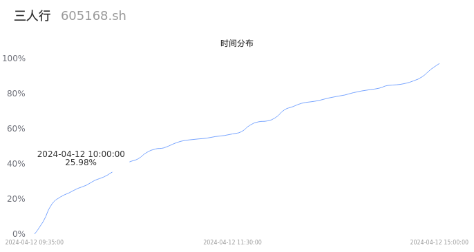 605168三人行2024年04月12日成交1.32万手,成交金额7344.04万元,相较昨日缩量6337手,换手率0.90%,成交清淡。