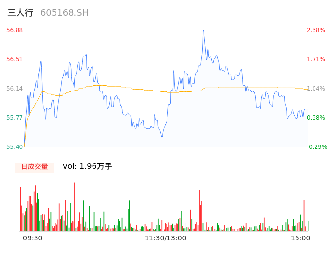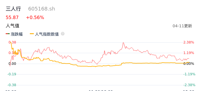 04月11日,三人行收报55.87,股价涨幅0.56%,成交金额1.10亿元,换手率1.34%。