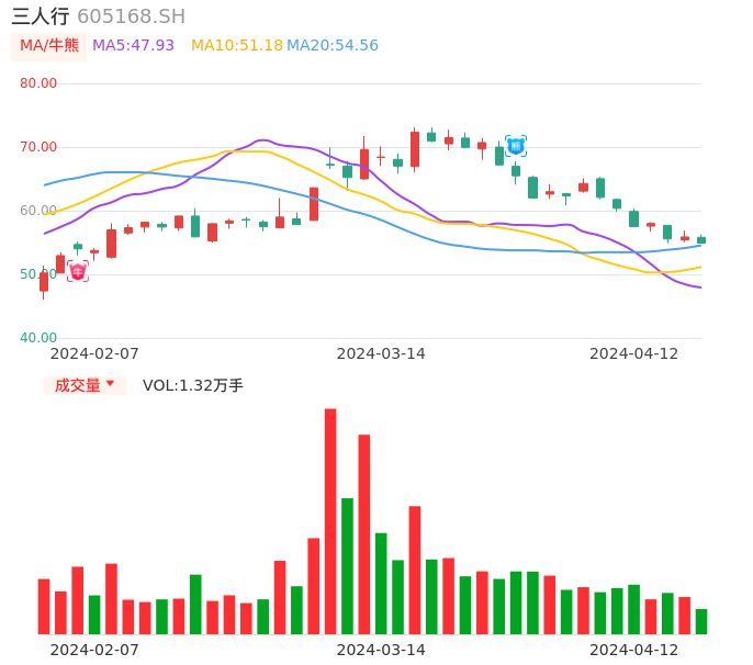 04月12日,三人行收报54.91,股价涨幅-1.72%,成交金额7344.04万元,换手率0.90%。