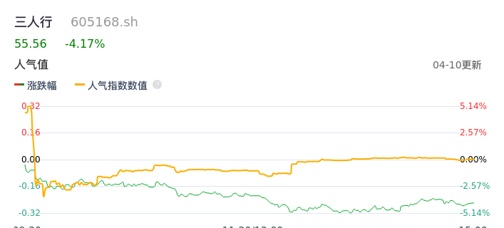 04月10日,三人行收报55.56,股价涨幅-4.17%,成交金额1.22亿元,换手率1.48%。