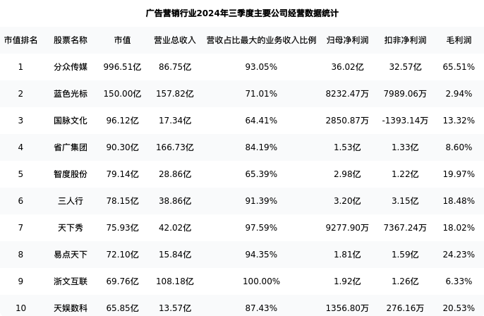 三人行最新报告期数据为三季度,下表汇总了广告营销行业内市值靠前的公司三季度主要经营数据