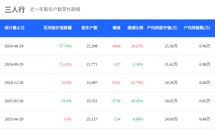 截至2025年6月30日,三人行(605168)的股东户数为2.51万,相比2025年3月31日减少了0.88%,户均持股数量环比增长了0.89%,户均持股市值达到了24.69万元,环比增长了2.81%。这些数据显示,尽管股东户数有所减少,但平均每户的持股量和市值都呈现上升趋势,这可能表明市场上的持股更加集中,机构投资者的比例可能有所增加。