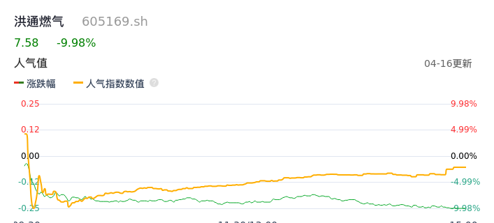 04月16日,洪通燃气收报7.58,股价涨幅-9.98%,成交金额4216.37万元,换手率4.10%。