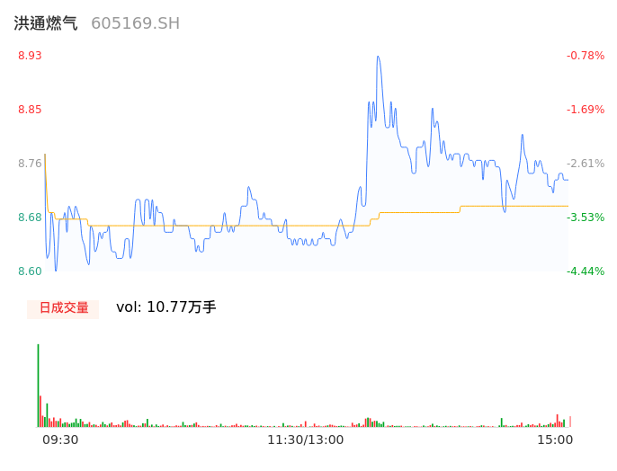 04月25日,洪通燃气收报8.75,股价涨幅-2.78%,成交金额9369.23万元,换手率8.13%。
