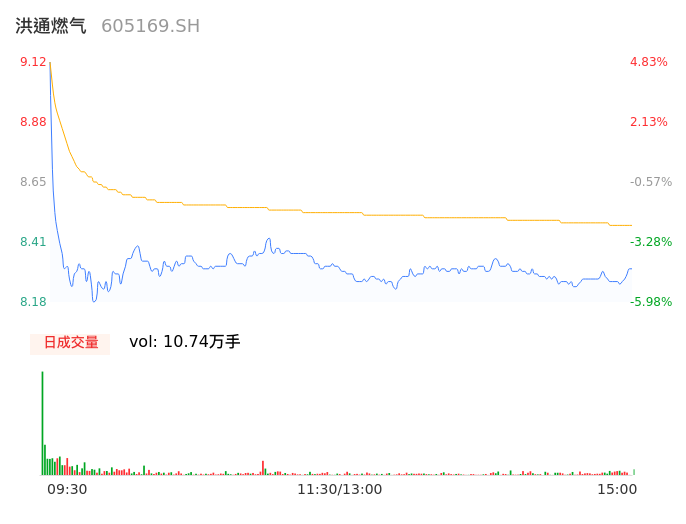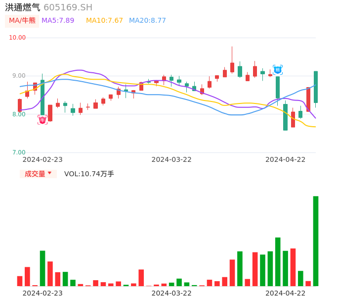 04月22日,洪通燃气收报8.30,股价涨幅-4.60%,成交金额9100.21万元,换手率8.11%。