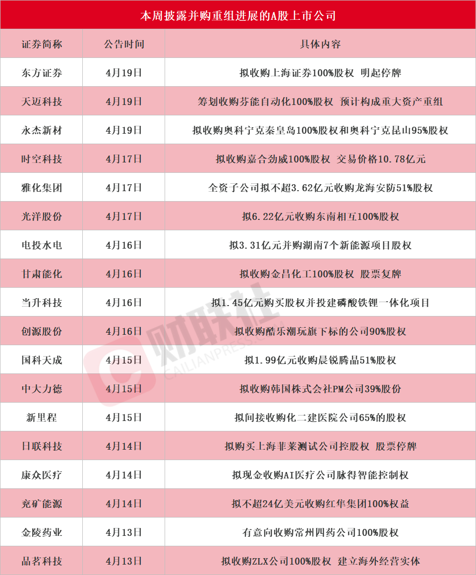 近20家A股上市公司本周披露并购重组最新公告 东方证券拟收购上海证券100%股权明起停牌