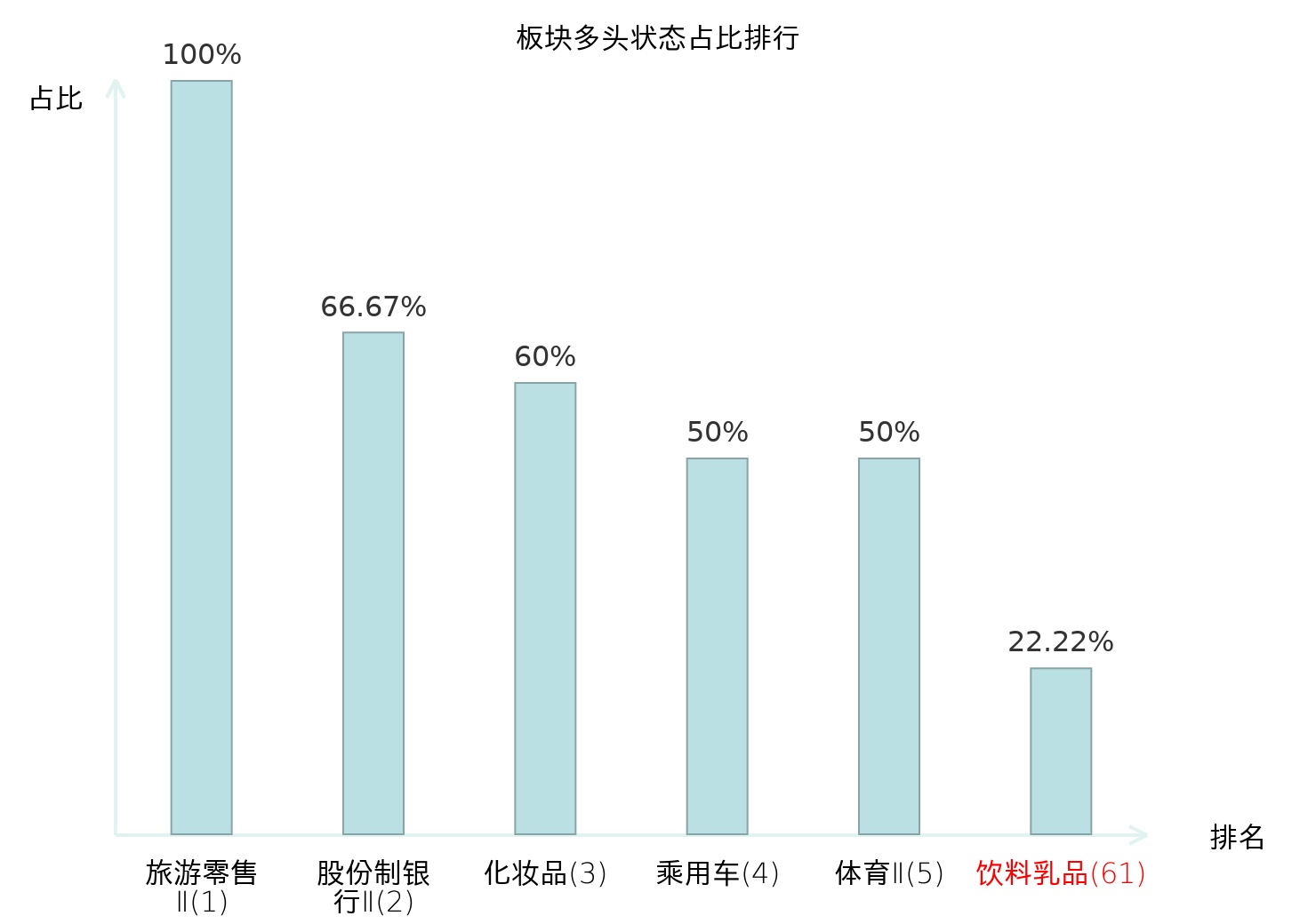 全市场所有行业板块中主力多头状态占比排名中,旅游零售Ⅱ板块位居第一。旅游零售Ⅱ板块名次提升最快,较昨日上升130位。