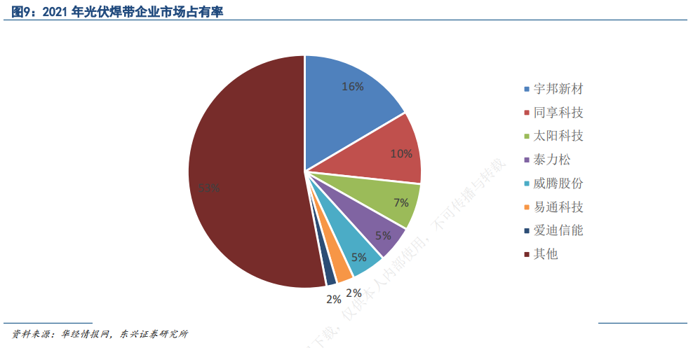 技术上,焊带产品迭代升级提速也在不断驱使行业门槛提升。焊带龙头企业与下游组件客户合作紧密,且具备资金优势,在行业比拼当中往往更有竞争优势。展望未来,在贸易政策日渐趋严的背景下,辅材辅料海外产能布局的重要性正日益上升。具有先进的生产技术和生产能力的光伏焊带龙头制造企业有望加速海外产能建设,进一步促进占有率提升。而龙头集中度的提升将使得光伏焊带的竞争格局更加良性,在光伏主产业链激烈竞争、比拼现金成本的背景下,焊带行业盈利能力的稳中改善可期。