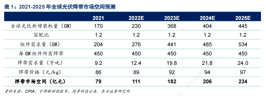在全球光伏装机快速增长的大背景下,光伏焊带行业市场规模随光伏装机量增长而扩张的逻辑也很清晰。假设每GW光伏组件需要消耗450吨焊带,随着CPI指数上涨与焊带产品优化升级,焊带的销售单价以每年3%的幅度上涨,同时假设容配比为1:1.2,则机构测算23-25年光伏焊带的市场需求量分别为19.8、21.8、24万吨。2025年焊带的市场规模将达234亿元,行业三年年均复合增速约28.3%。