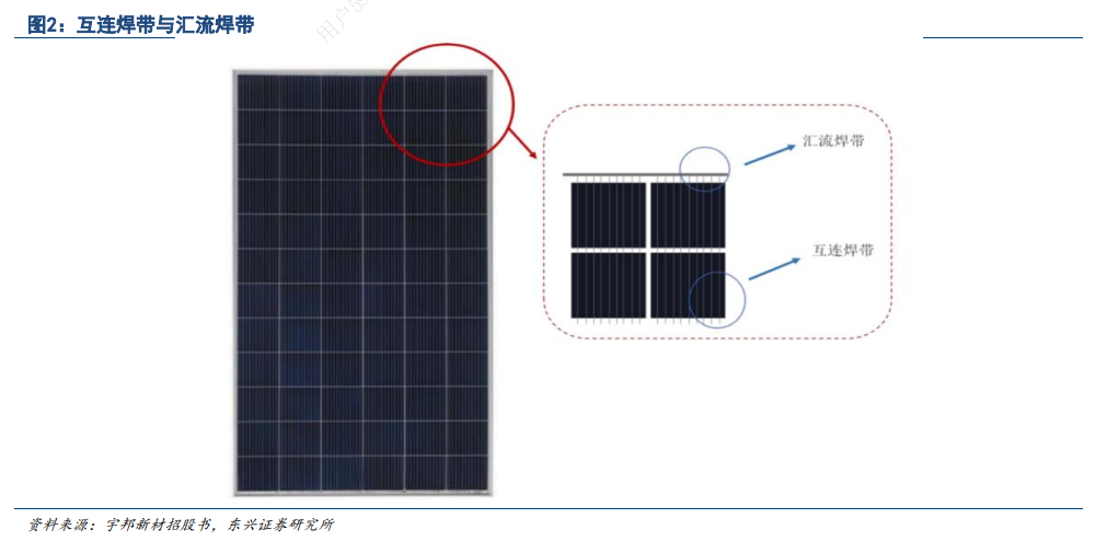 光伏焊带是光伏组件焊接过程中的重要材料,按用途主要分为汇流焊带和互连焊带。其中,互连焊带用于连接光伏电池片,收集、传输光伏电池片电流。汇流焊带用于连接光伏电池串及接线盒,传输光伏电池串电流。