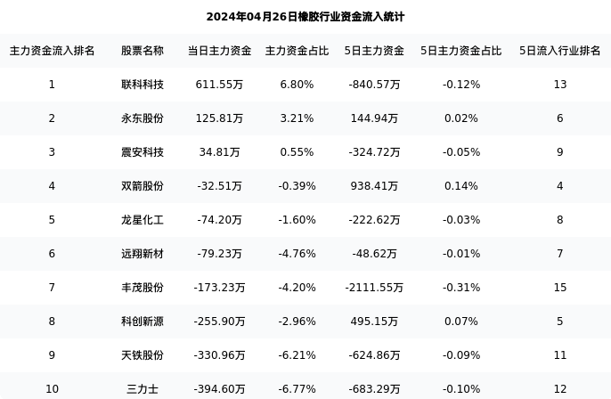 从主力资金流向来看,橡胶行业今日主力资金流入2.15亿元,在所有申万二级行业中排名:50/131。
