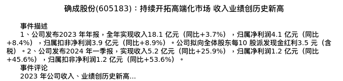值得注意的是:2024年05月长江证券的马太/叶家宏分析师,首次发布关于确成股份的研究报告,标题为:确成股份(605183):持续开拓高端化市场 收入业绩创历史新高。