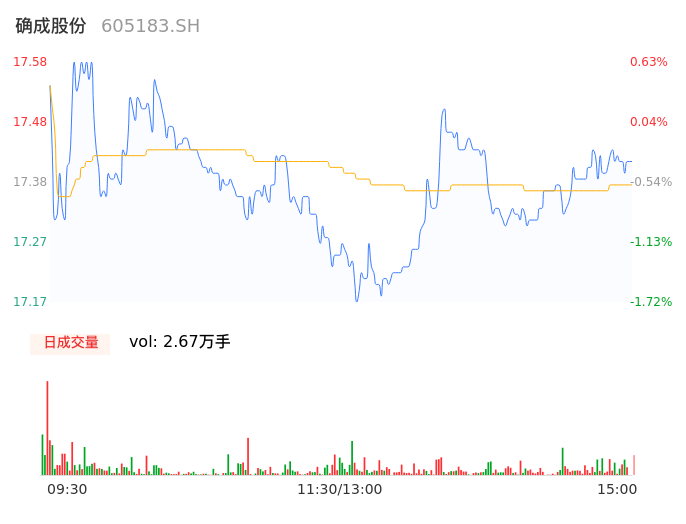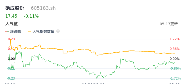 05月17日,确成股份收报17.45,股价涨幅-0.11%,成交金额4638.79万元,换手率0.64%。