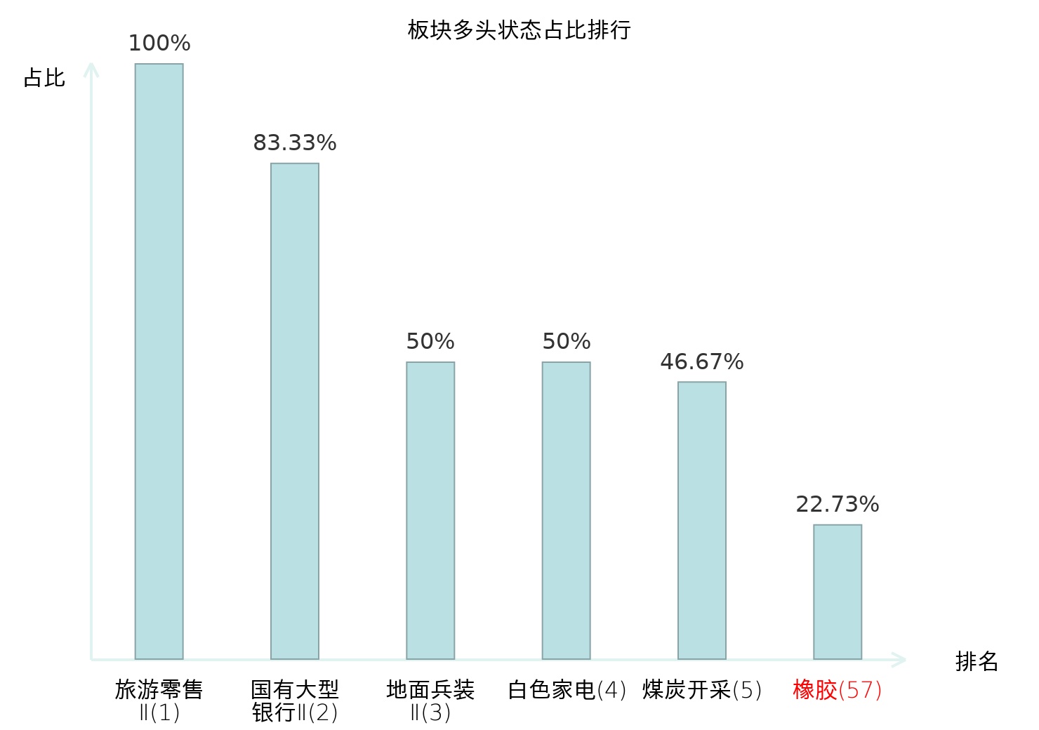 全市场所有行业板块中主力多头状态占比排名中,旅游零售Ⅱ板块位居第一。油服工程板块名次提升最快,较昨日上升107位。