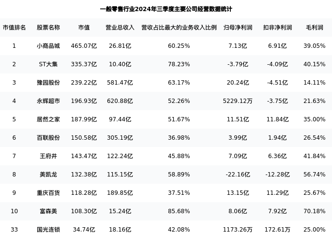 国光连锁最新报告期数据为三季度,下表汇总了一般零售行业内市值靠前的公司三季度主要经营数据