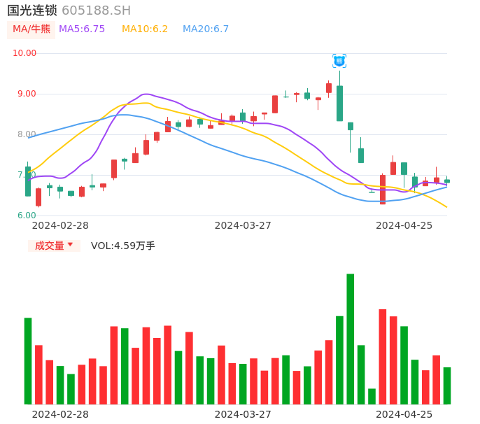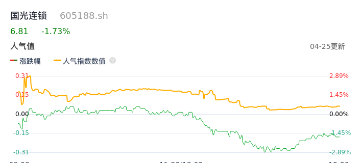 04月25日,国光连锁收报6.81,股价涨幅-1.73%,成交金额3144.64万元,换手率0.93%。