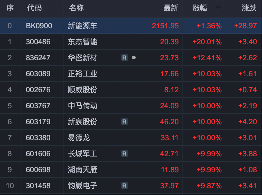 新能源车板块在月初公布上个月销量数据刺激下周期性走强。今日,东杰智能等多股20%涨停,华密新材、正裕工业、顺威股份、中马传动等多股涨停或涨超10%。