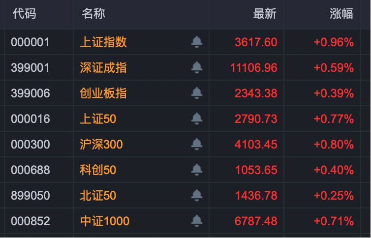 今日,A股继续强势上攻,上证指数高开高走,再度收在3600点之上。成长股表现活跃,中证1000创近两年半新高。近4000只个股上涨,成交温和放大至1.62万亿元。