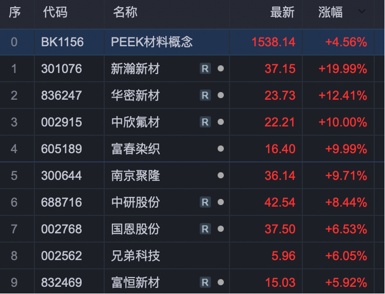 市场热点方面,PEEK材料概念全天保持强势,板块指数高开高走,放量大涨4.41%,创历史新高。新瀚新材20%涨停,股价创历史新高(复权,下同),华密新材、中欣氟材、富春染织等亦涨停或涨超10%。