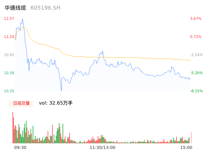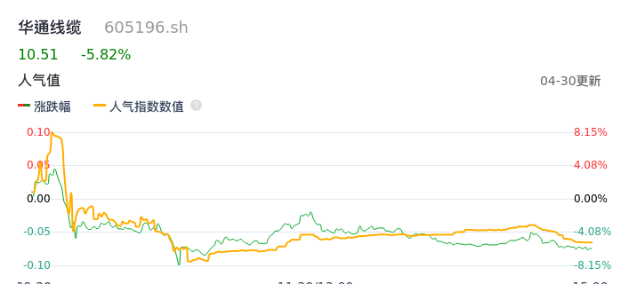 04月30日,华通线缆收报10.51,股价涨幅-5.82%,成交金额3.53亿元,换手率10.02%。