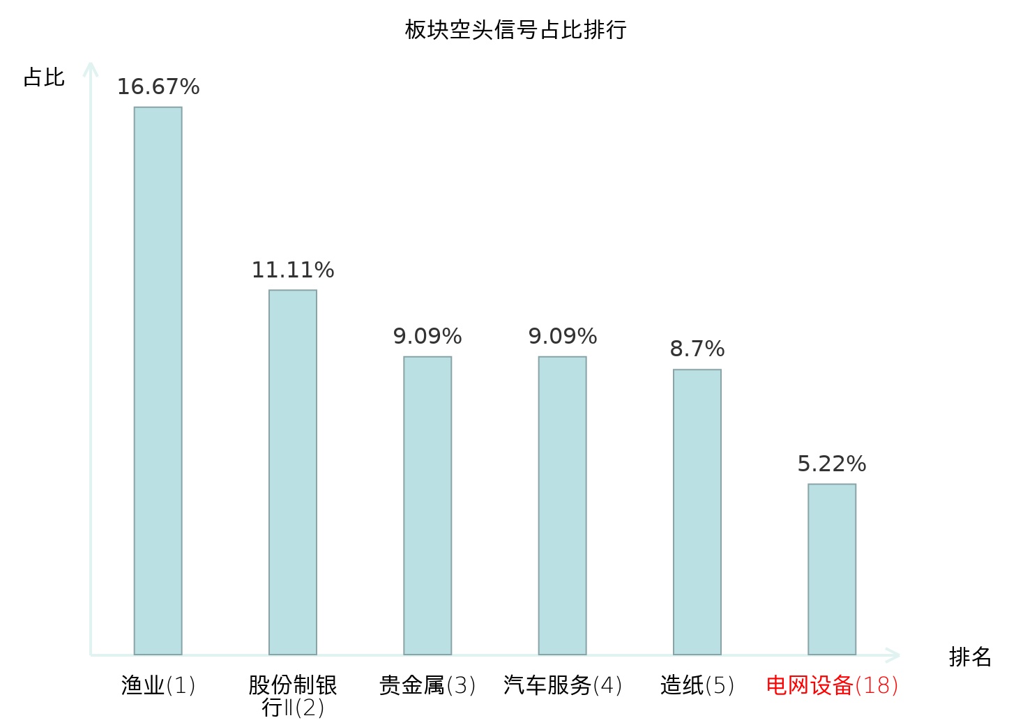全市场所有行业板块中主力空头信号占比排名中,渔业板块位居第一。电机Ⅱ板块名次提升最快,较昨日上升113位。