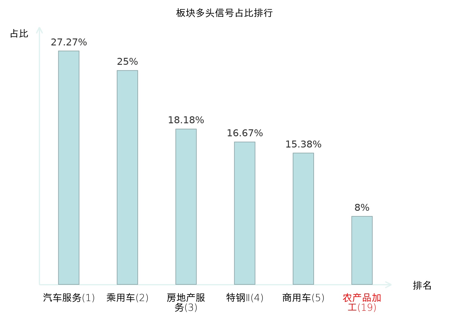 全市场所有行业板块中主力多头信号占比排名中,汽车服务板块位居第一。乘用车板块名次提升最快,较昨日上升117位。