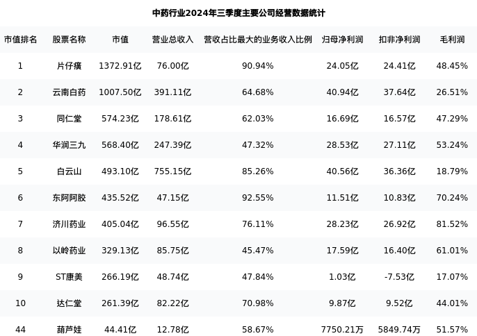 葫芦娃最新报告期数据为三季度,下表汇总了中药行业内市值靠前的公司三季度主要经营数据