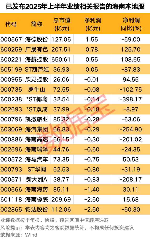 据证券时报·数据宝统计,截至8月4日,已有18只海南本地股发布2025年半年度相关报告。从净利润规模来看(按照半年报、快报、预告区间中值顺序选取,下同),海德股份、广晟有色、海航控股、ST葫芦娃上半年归母净利润依次为1.55亿元、0.78亿元、0.55亿元、0.05亿元。