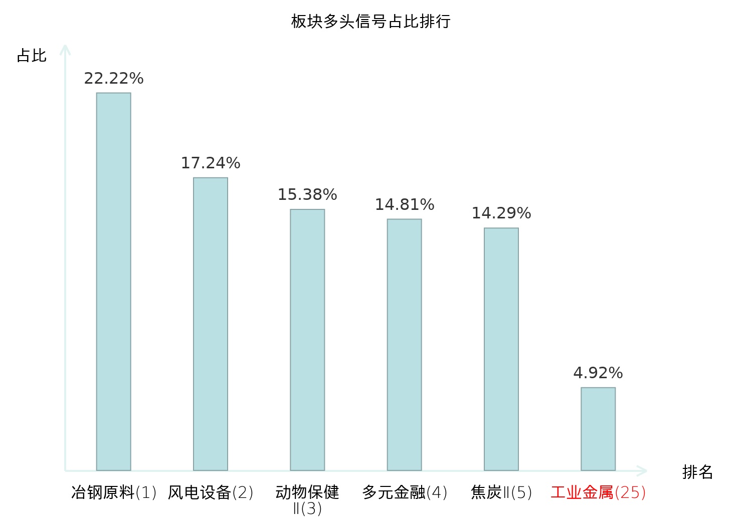 全市场所有行业板块中主力多头信号占比排名中,冶钢原料板块位居第一。冶钢原料板块名次提升最快,较昨日上升118位。