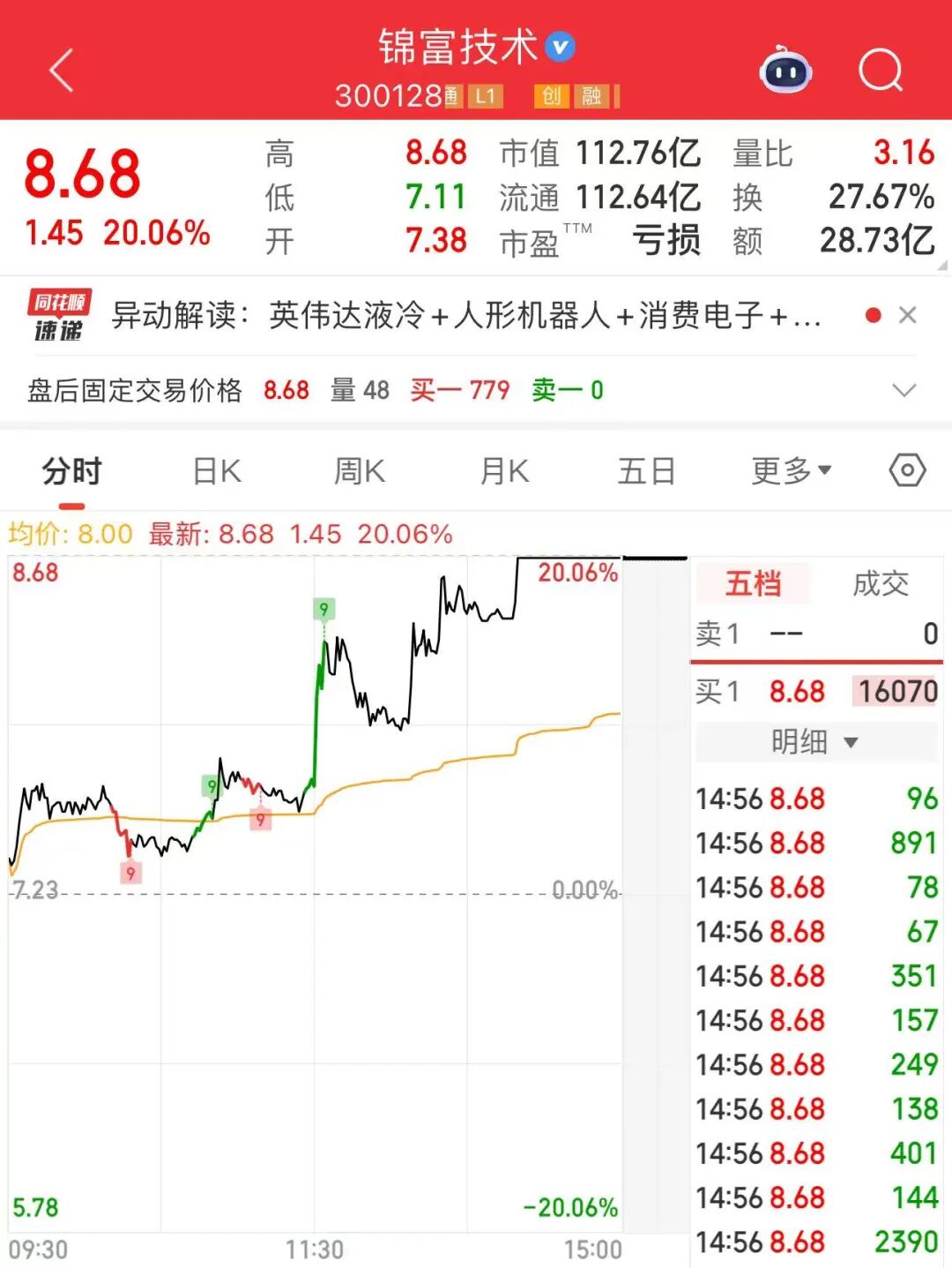 锦富技术午后震荡走强,临近尾盘直线拉升,实现“20CM”涨停,股价报8.68元/股,创阶段新高。今日午间,锦富技术在其微信公众号发布消息称,公司收到液冷板订单。