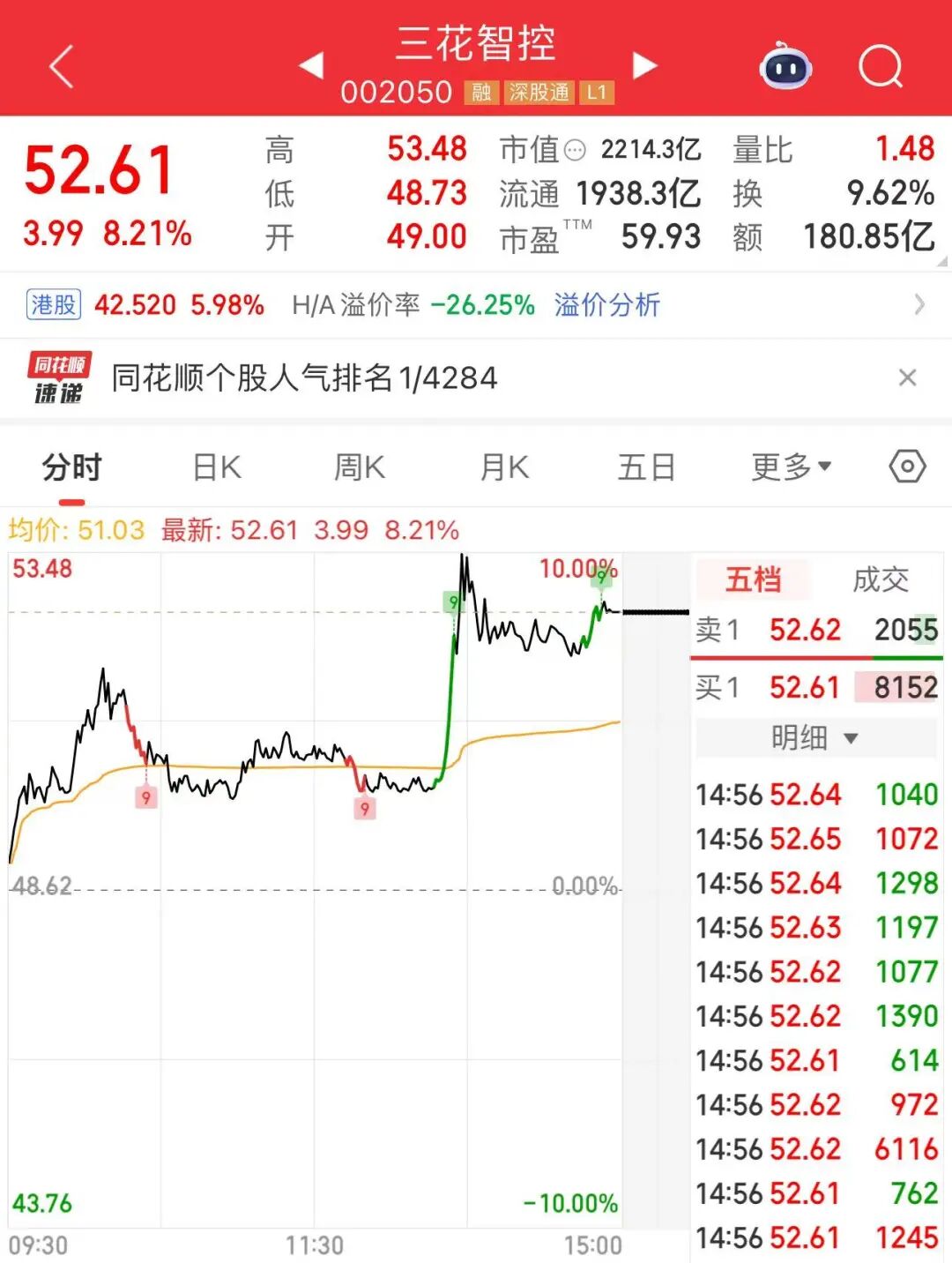 三花智控盘中直线拉升,一度触及涨停,盘中股价创历史新高,收盘涨幅收窄至8.21%,报52.61元/股,成交额为180.85亿元,最新市值为2214.3亿元,位于Wind证券人气榜和同花顺热榜第一名。