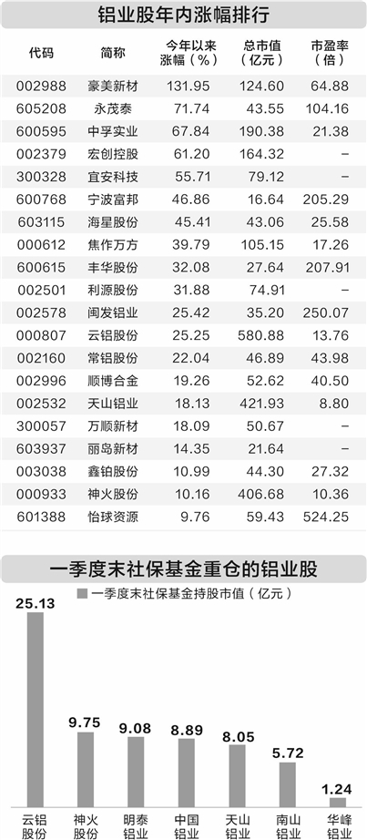 部分铝业板块个股盈利稳定、长期分红,备受社保基金青睐,一季报数据显示,7只个股获得社保基金重仓,占总数比例超过两成。云铝股份、神火股份和明泰铝业一季度末获社保基金持股市值最高,分别为25.13亿元、9.75亿元和9.08亿元。