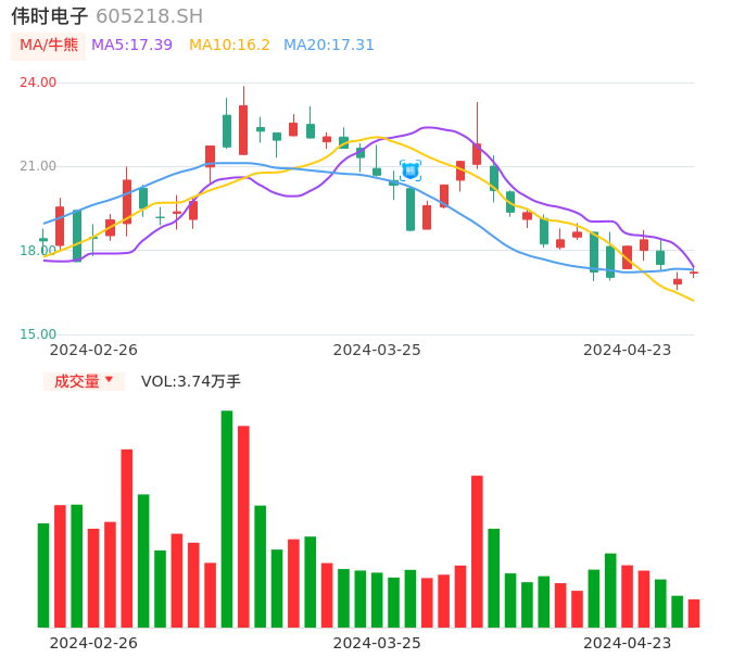 04月23日,伟时电子收报17.22,股价涨幅1.47%,成交金额6433.79万元,换手率1.76%。