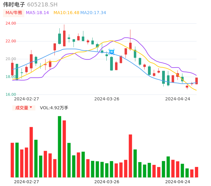 04月24日,伟时电子收报17.89,股价涨幅3.89%,成交金额8654.05万元,换手率2.31%。