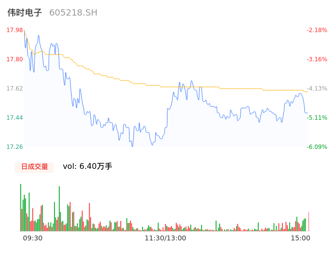 04月19日,伟时电子收报17.50,股价涨幅-4.79%,成交金额1.13亿元,换手率3.01%。